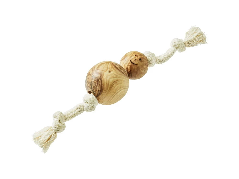 Der ca. 30 cm lange Olivi Tau-Spielzeug Schneemann besteht aus naturbelassenem, mit Olivenöl veredeltem Olivenholz und einem Tau aus Baumwolle. Zum Spielen, Kauen, Zergeln und Apportieren. Auch für Welpen und Junghunde geeignet.