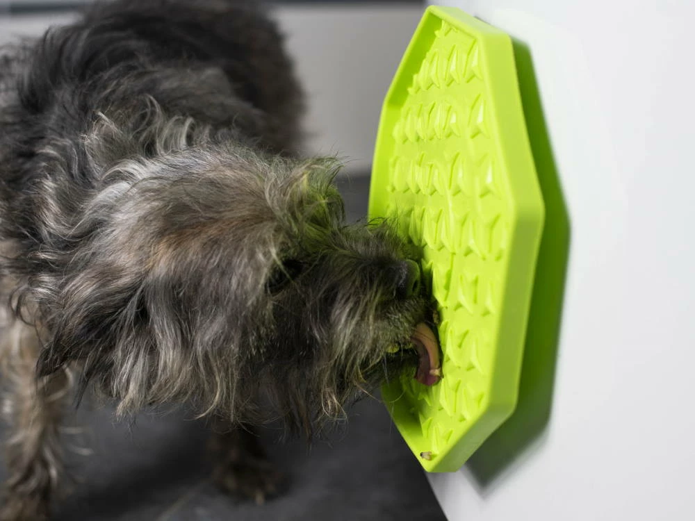 Dein Hund wird begeistert sein und ganz nebenbei lange damit beschäftigt sein die Vertiefungen der Matte auszuschlecken.