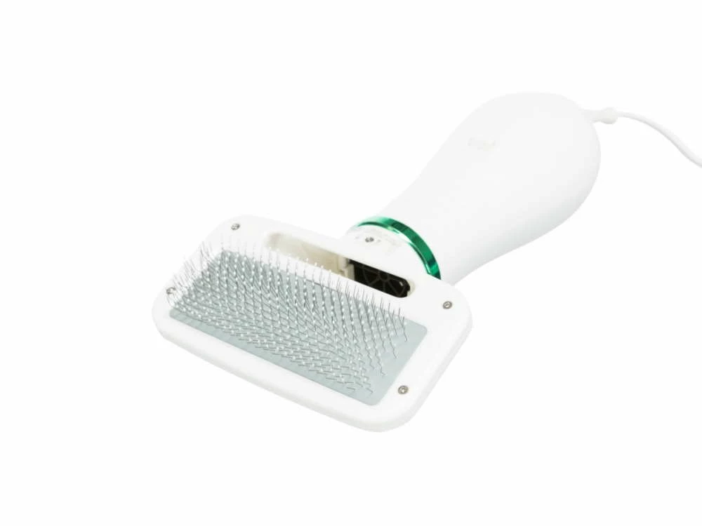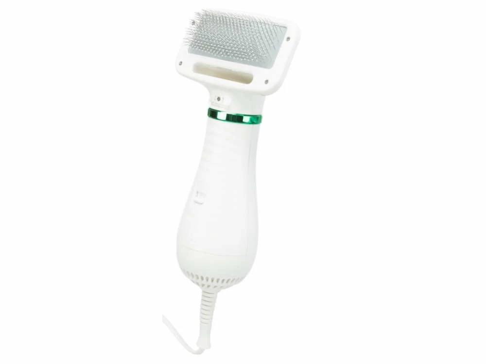 Die Warmluftbürste für Hunde bietet 2 Funktionen in einem Gerät: Du kannst deinen Hund gleichzeitig kämmen und stylen. Der austauschbare Bürstenkopf mit Kunststoffborsten und Noppen wird von einem geräuscharmen Motor angetrieben und verfügt über 2 Wärmestufen – einen sanften, warmen Luftstrom und einen starken, heißen Luftstrom.